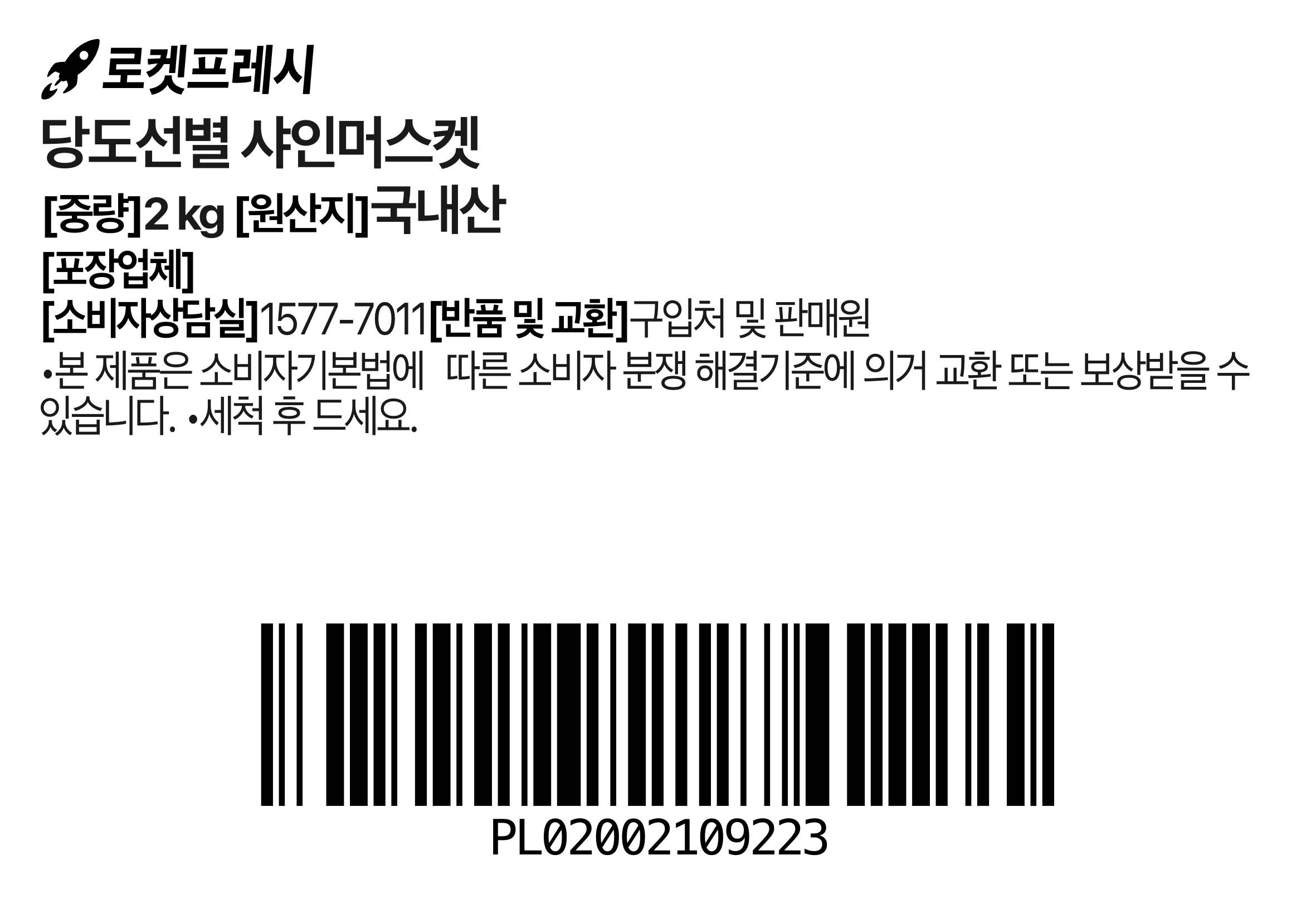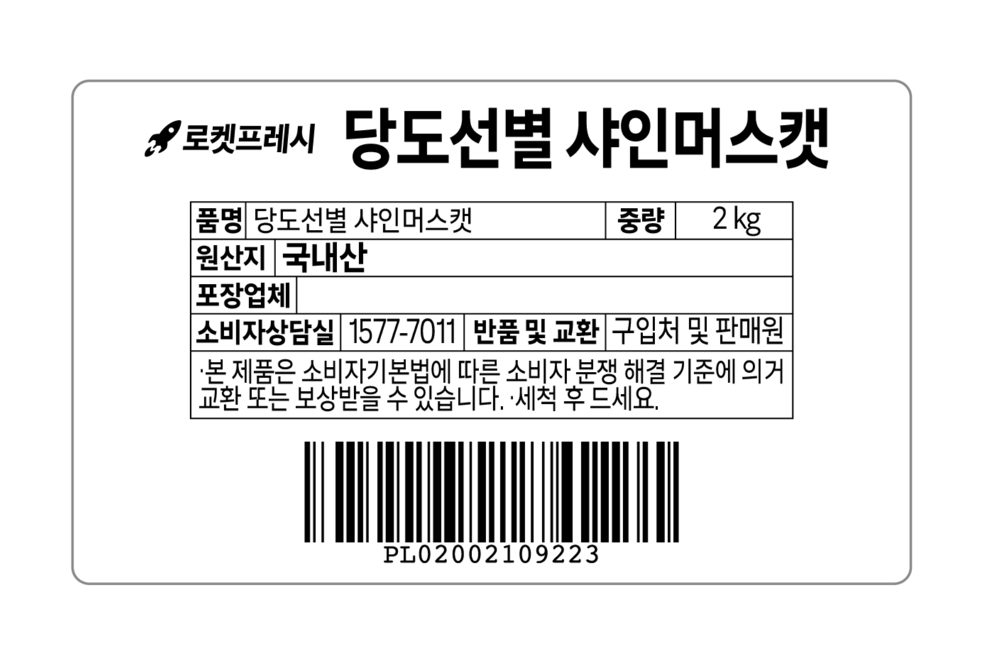 | 품목 또는 명칭 | 당도선별 샤인머스캣 | 포장단위별 내용물의 용량(중량),수량,크기 | 2 kg, 1 개 |