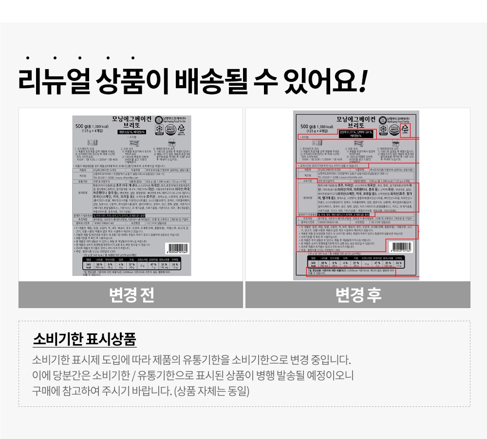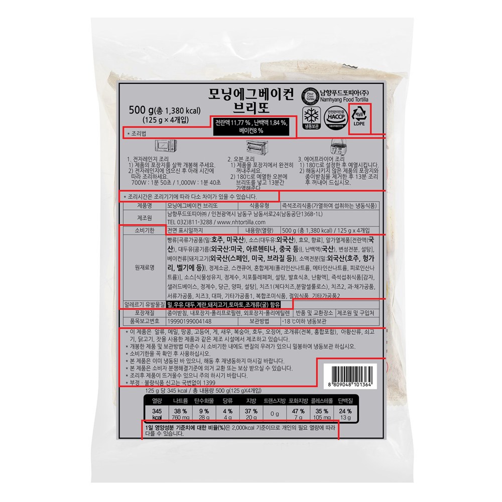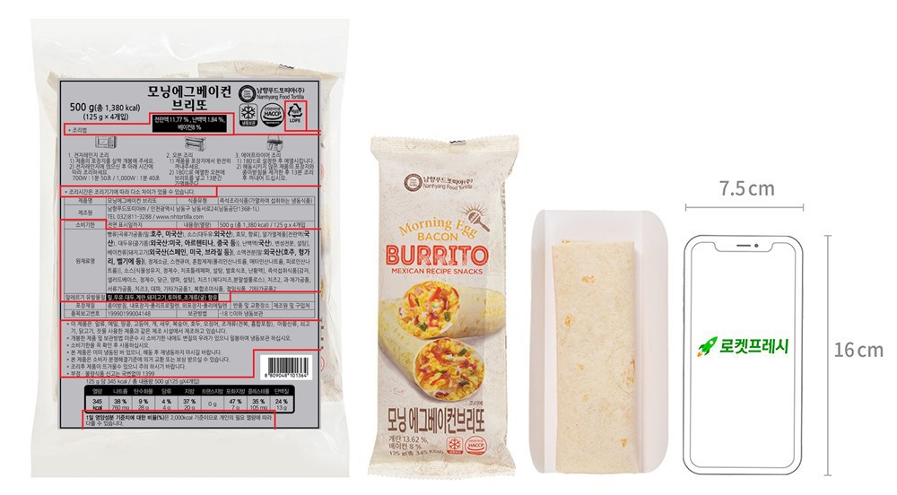 | 제품명 | 모닝에그베이컨브리또 | 식품의 유형 | 컨텐츠 참조 |
