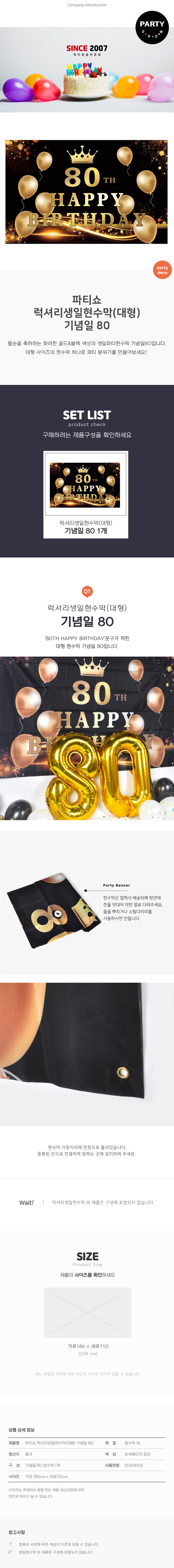 | 품명 및 모델명 | 파티쇼 럭셔리생일현수막 기념일80 186 x 110 cm | 인증/허가 사항 | 해당없음 |