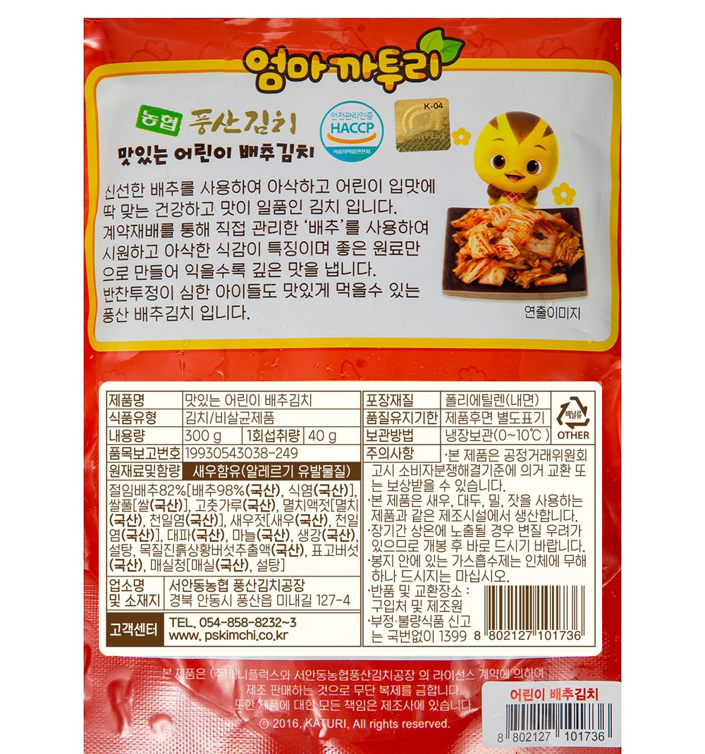 | 제품명 | 맛있는 어린이 배추김치 | 식품의 유형 | 컨텐츠참조 |