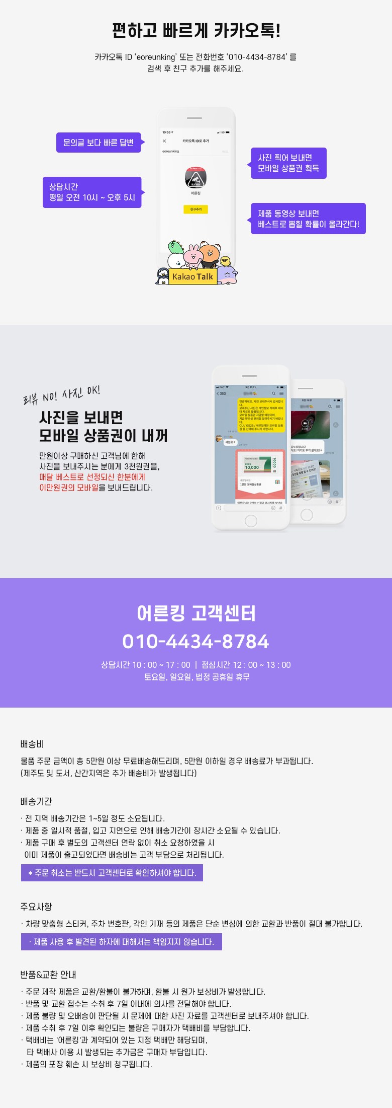 - ㆍ모니터 해상도의 차이로 인해 색상이나 이미지가 실제와 달라, 고객이 단순 변심으로 교환/반품을 무료로 요청하는 경우