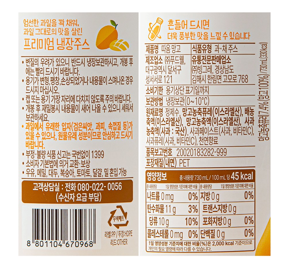 | 포장단위별 내용물의 용량(중량), 수량 | 730ml x 8개,1개 | 원재료명 및 함량 | 컨텐츠 참조 |