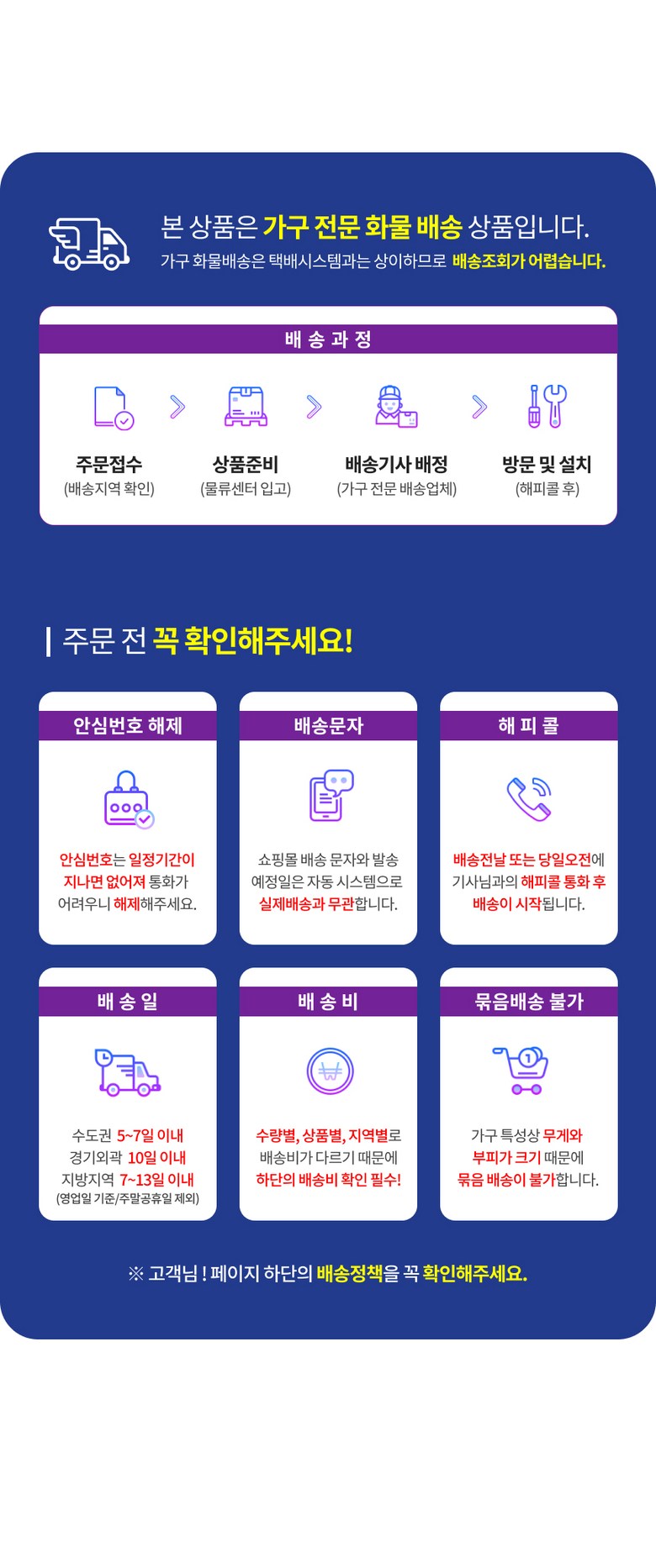 | 배송기간 | ㆍ도서산간 지역 등은 배송에 3-5일이 더 소요될 수 있습니다. - 천재지변, 물량 수급 변동 등 예외적인 사유 발생 시, 다소 지연될 수 있는 점 양해 부탁드립니다. | ||