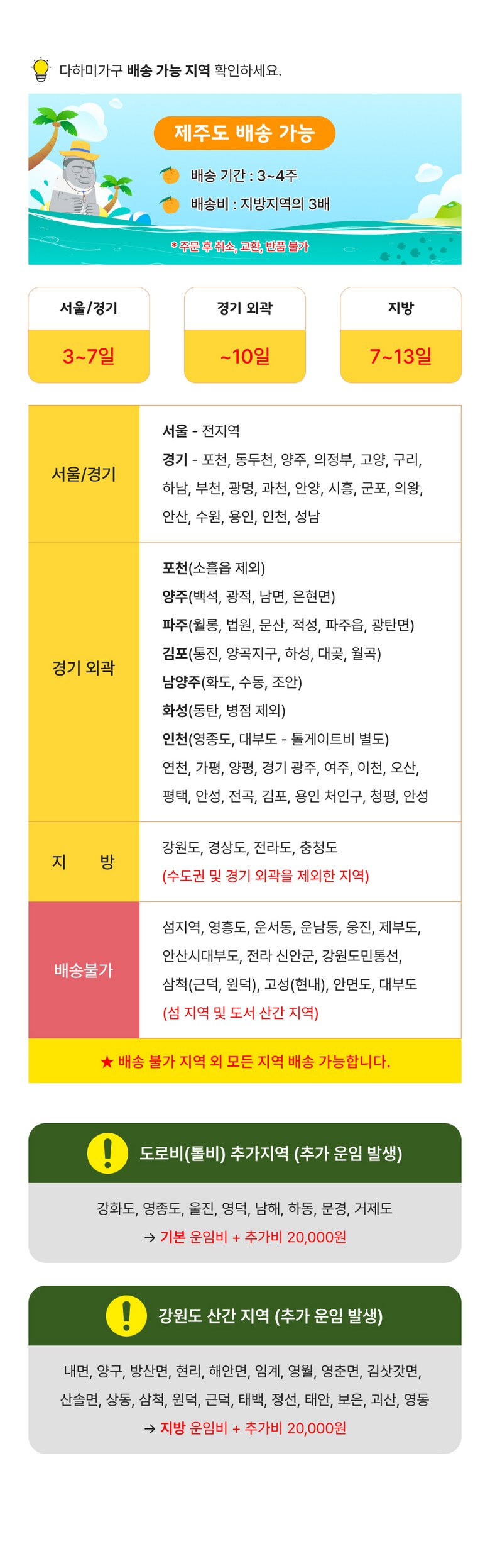 | 배송방법 | 업체직송 | 배송비 | 착불배송(상품별 배송비, 배송가능지역은 상세페이지 참조) · 도서산간 추가 배송비 - 제주 지역: 30,000원 - 도서산간 지역: 0원 |