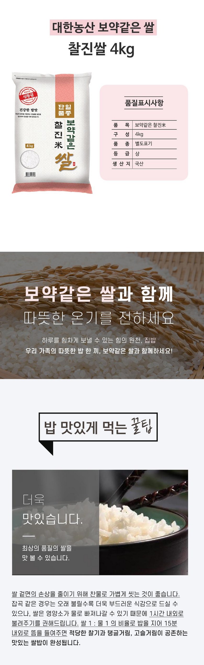 | 품목 또는 명칭 | 찰진쌀 | 포장단위별 내용물의 용량(중량),수량,크기 | 4kg 1봉 |