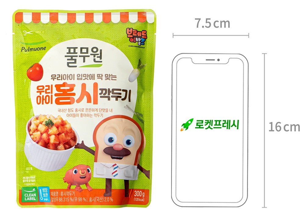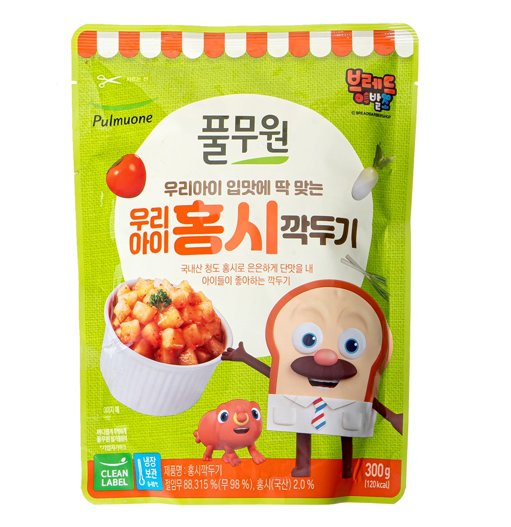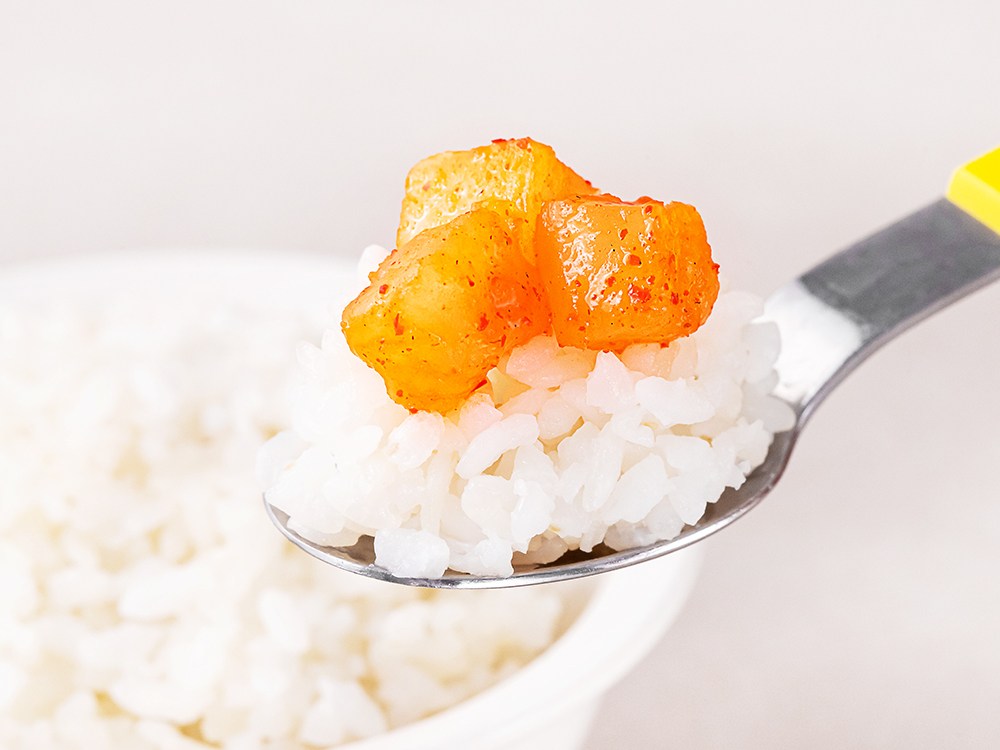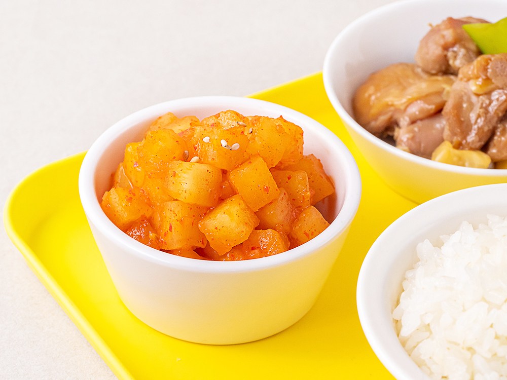 순한 맛 고춧가루를 사용하고 삼삼하게 만들어 아이들 입맛에 맞춘 깍두기입니다. 신선한 홍시를 더해 달달하고 풍성한 풍미를 자랑하죠. 아삭아삭 청량한 절임무와 갖은 재료의 조화가 일품이랍니다. 아이들이 먹기 좋은 크기로 담아 자를 필요 없이 바로 즐길 수 있어요.