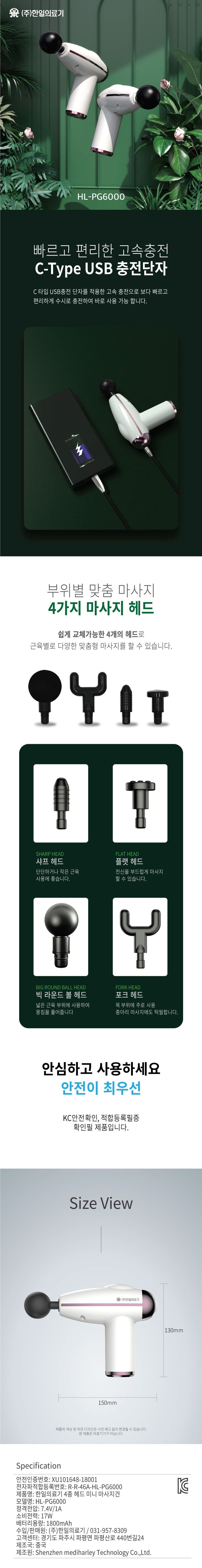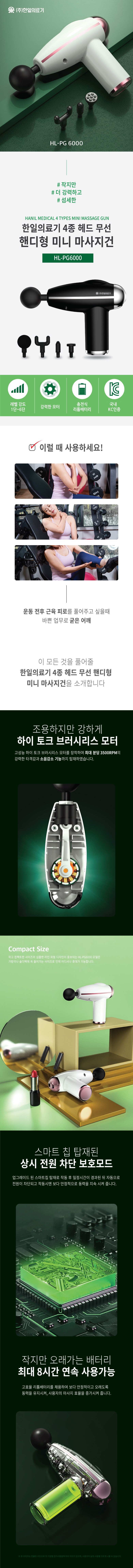 | 품명 및 모델명 | HanilMedical 4종 헤드 무선 핸디형 미니 마사지건 블랙 / HL-PG6000 | KC 인증정보 | 본품: R-R-46A-HL-PG6000 / 전지: XU101648-18001A |