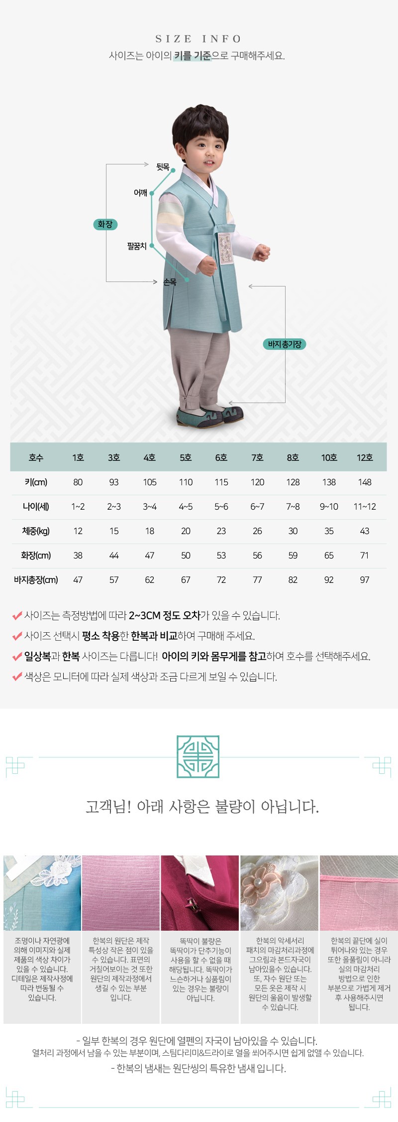| 색상 | 연북청색(쾌자), 아이보리(저고리), 연핑크(바지) | 재질 | 폴리에스테르100% |