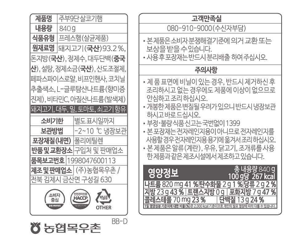 | 제품명 | 주부9단 살코기햄 | 식품의 유형 | 프레스햄(살균제품) |