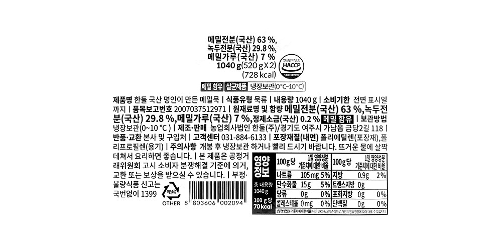 | 포장단위별 내용물의 용량(중량), 수량 | 520g*2개 | 원재료명 및 함량 | 컨텐츠참조 |