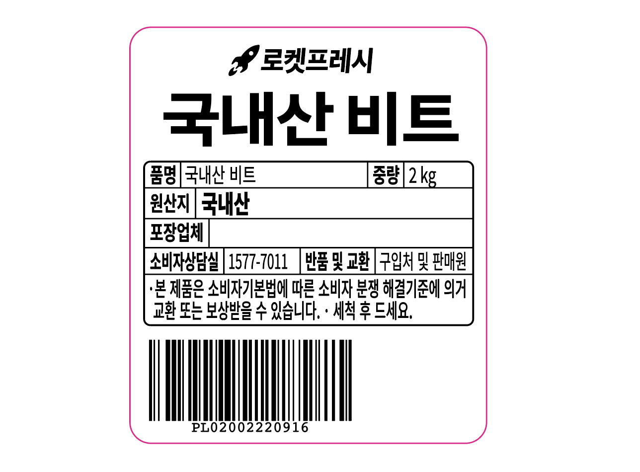 | 품목 또는 명칭 | 국내산 비트 | 포장단위별 내용물의 용량(중량),수량,크기 | 2kgx6개 |