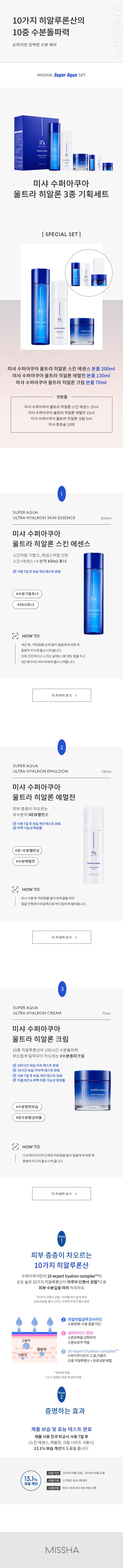 | 용량(중량) | 스킨에센스 : 200ml, 에멀전 : 130ml, 크림 : 70ml, 스킨에센스 : 15ml, 에멀전 : 15ml, 크림 : 5ml | 제품 주요 사양 | 모든 피부용 |