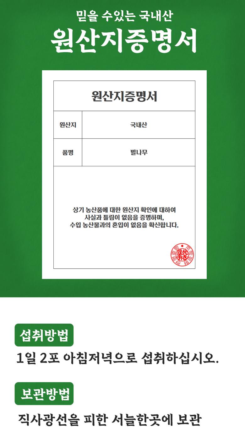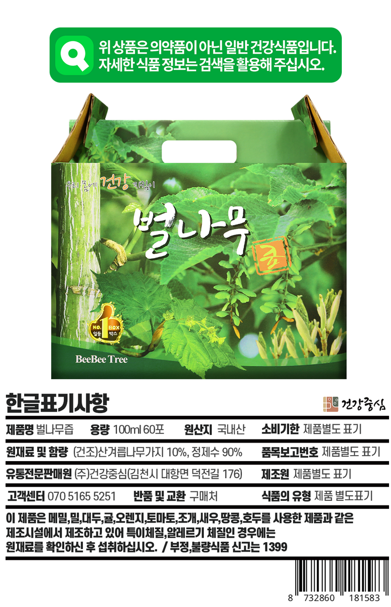 | 포장단위별 내용물의 용량(중량), 수량 | 100ml 60포 | 원재료명 및 함량 | 산겨릅나무가지추출액(국내산) 100%(정제수포함) |