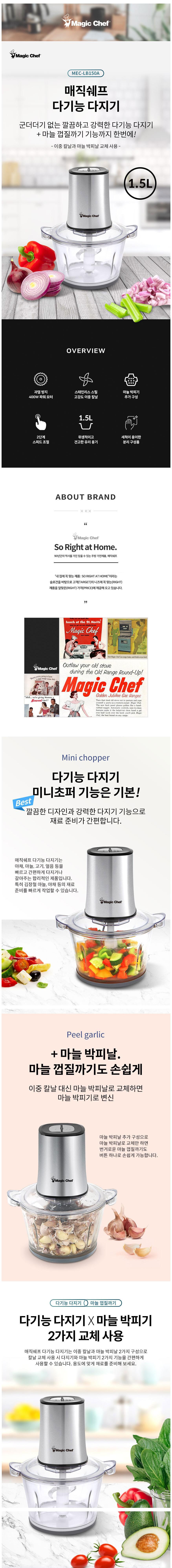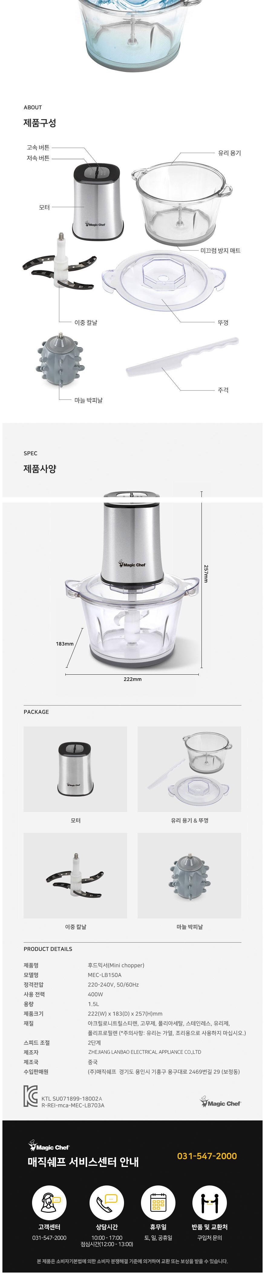 | 품명 및 모델명 | 매직쉐프 다기능 다지기 MEC-LB150A | KC 인증정보 | R-REI-mca-MEC-LB703A, SU071899-18002A |