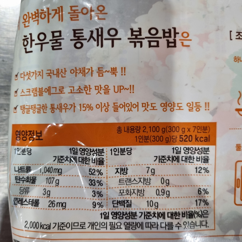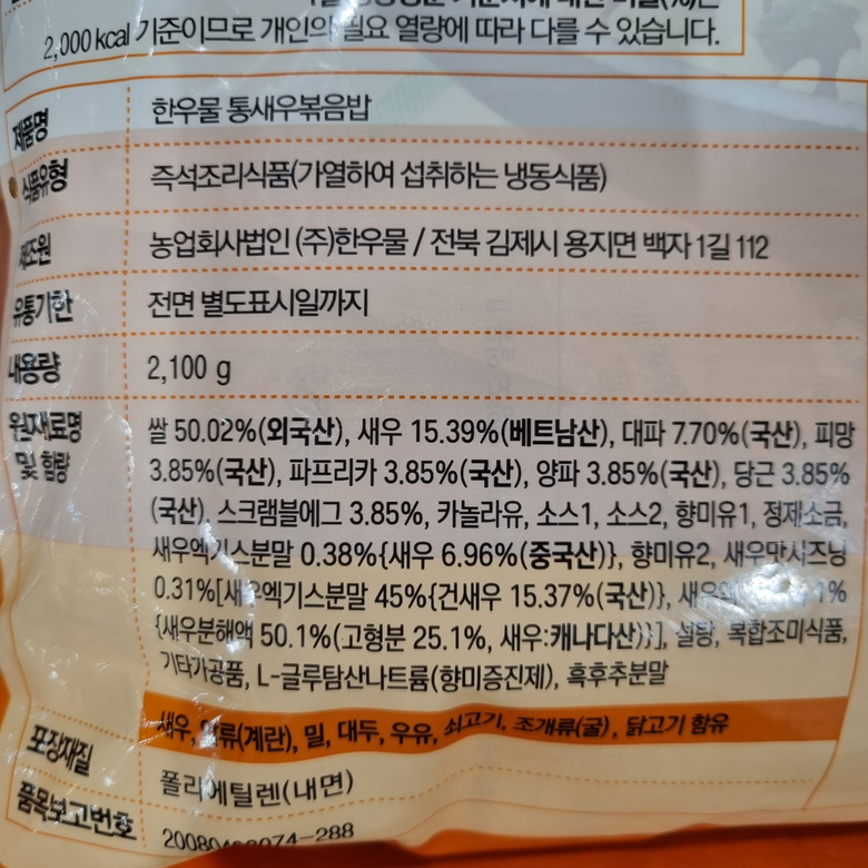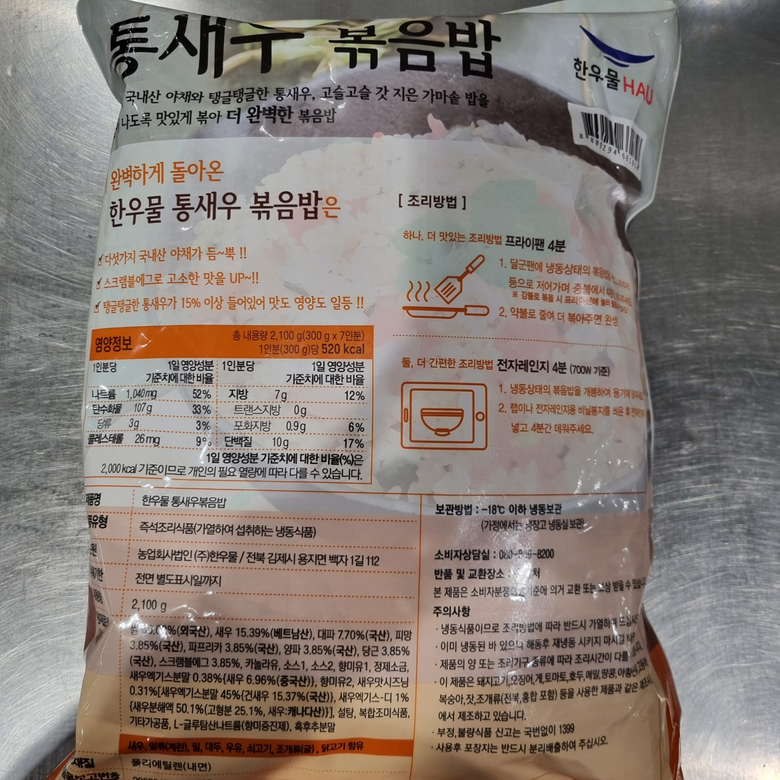 | 품목 또는 명칭 | 한우물 새우볶음밥 | 포장단위별 내용물의 용량(중량),수량,크기 | 상품 상세페이지 참조 |