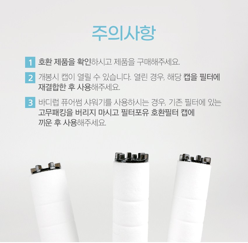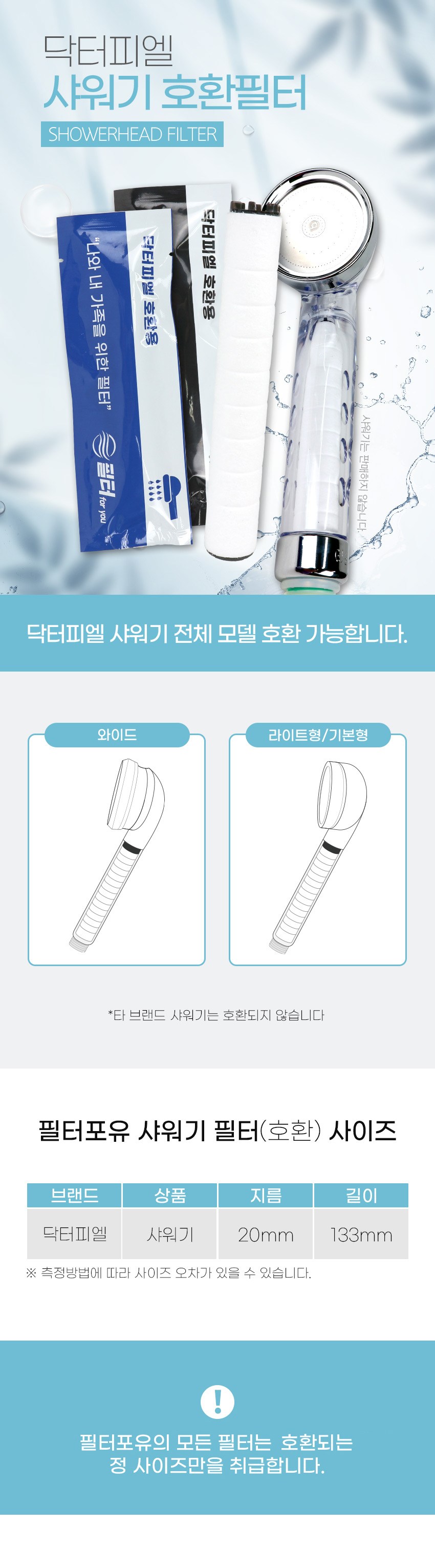 | 품명 및 모델명 | 필터포유 닥터피엘 샤워기 호환필터 염소녹물제거용 개별포장 | 인증/허가 사항 | 해당없음 |