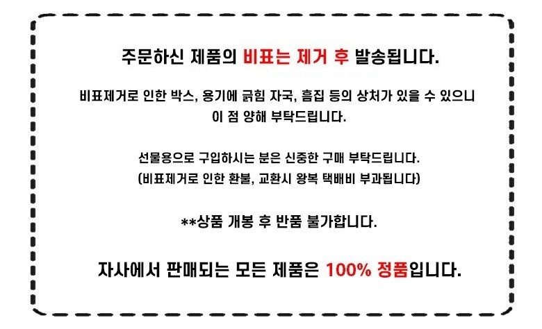 - ㆍ모니터 해상도의 차이로 인해 색상이나 이미지가 실제와 달라, 고객이 단순 변심으로 교환/반품을 무료로 요청하는 경우