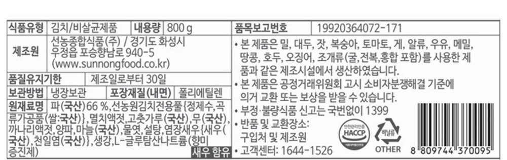 | 제품명 | 파김치 | 식품의 유형 | 컨텐츠 참조 |