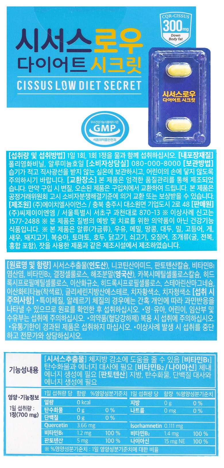 | 제품명 | 시서스로우 다이어트 시크릿 | 제조업소의 명칭과 소재지 | (주)에이치엘사이어스/충북 충주시 대소원면 기업도시2로 48 |