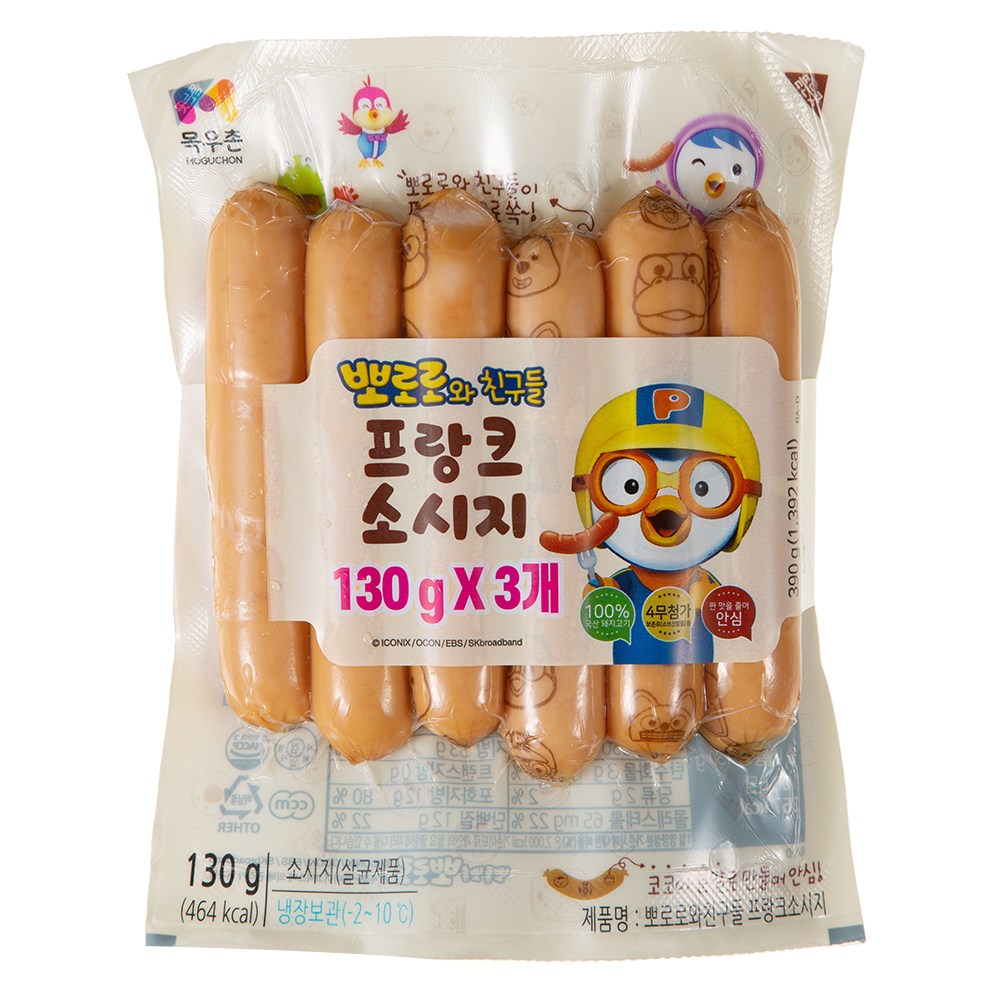 아이들 입맛에 맞춘 담백한 프랑크 소시지예요. 신선한 돼지고기를 사용해 탱글탱글한 식감이 일품이죠. 아이들이 좋아할 뽀로로와 친구들의 캐릭터를 코코아 분말로 인쇄했어요. 조리 후 밥반찬으로 활용하시거나, 핫도그, 파스타 등 다양한 요리에 쏙 넣어 드셔 보세요.