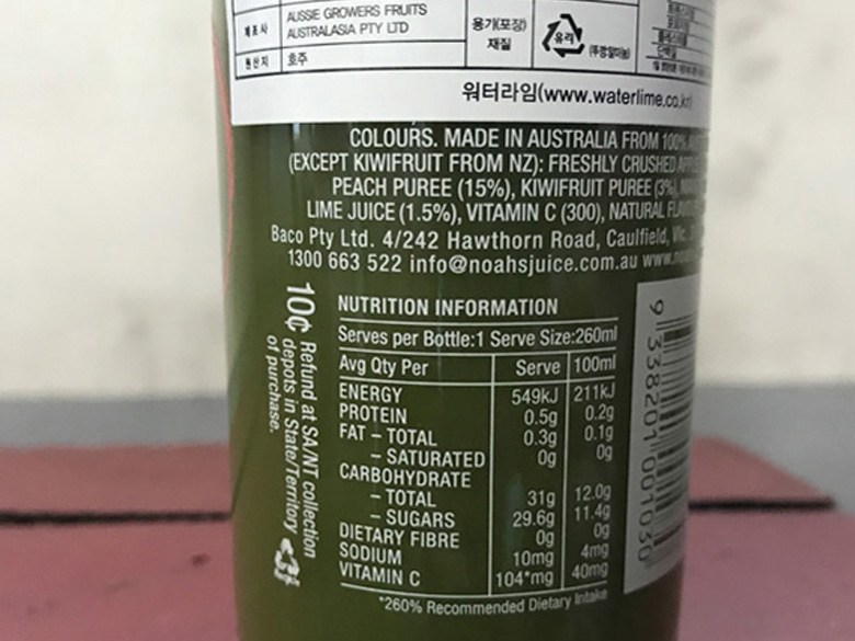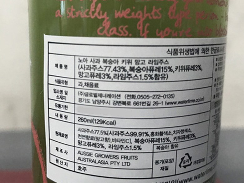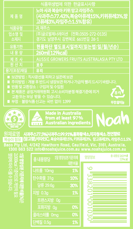 | 제품명 | 노아 사과 복숭아 키위 망고 라임주스 | 식품의 유형 | 과,채주스 |