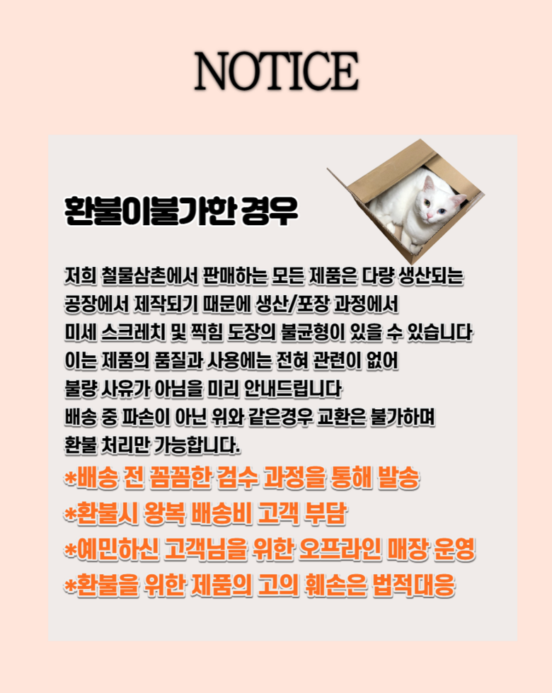 - ㆍ모니터 해상도의 차이로 인해 색상이나 이미지가 실제와 달라, 고객이 단순 변심으로 교환/반품을 무료로 요청하는 경우