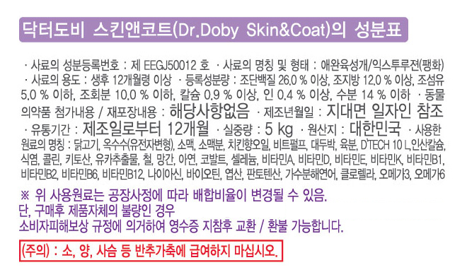 | 품명 및 모델명 | 닥터도비 스킨앤코트 | 인증/허가 사항 | 사료관리법에 따른 성분등록번호 : 컨텐츠 참조 |