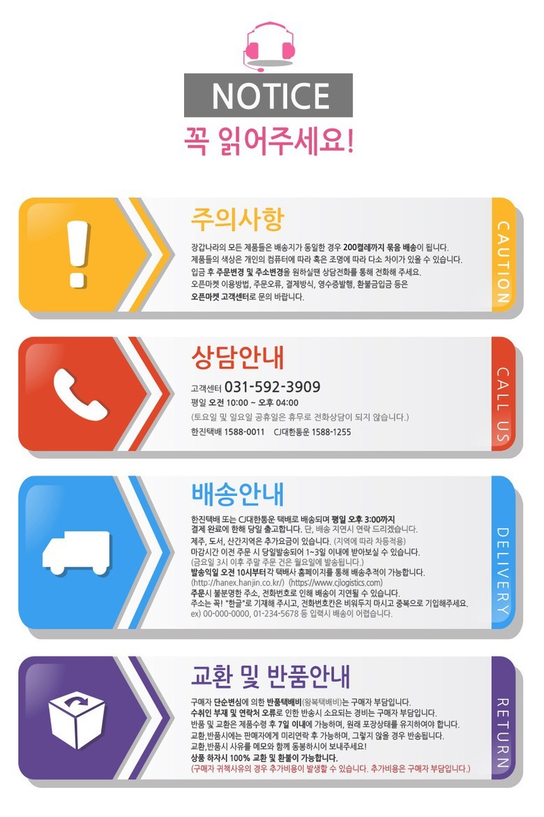 - ㆍ모니터 해상도의 차이로 인해 색상이나 이미지가 실제와 달라, 고객이 단순 변심으로 교환/반품을 무료로 요청하는 경우
