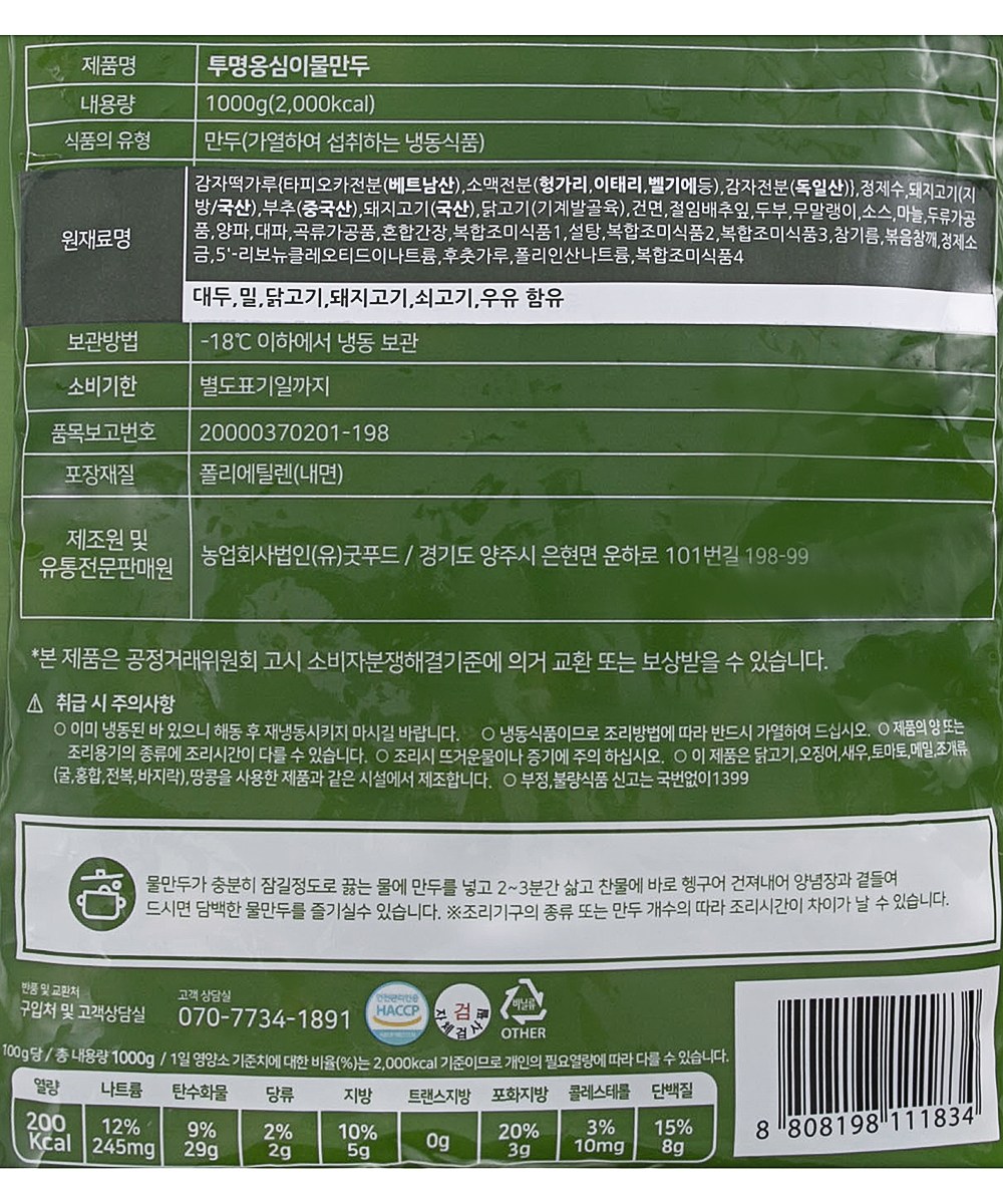 | 제품명 | 투명옹심이물만두 | 식품의 유형 | 컨텐츠 참조 |