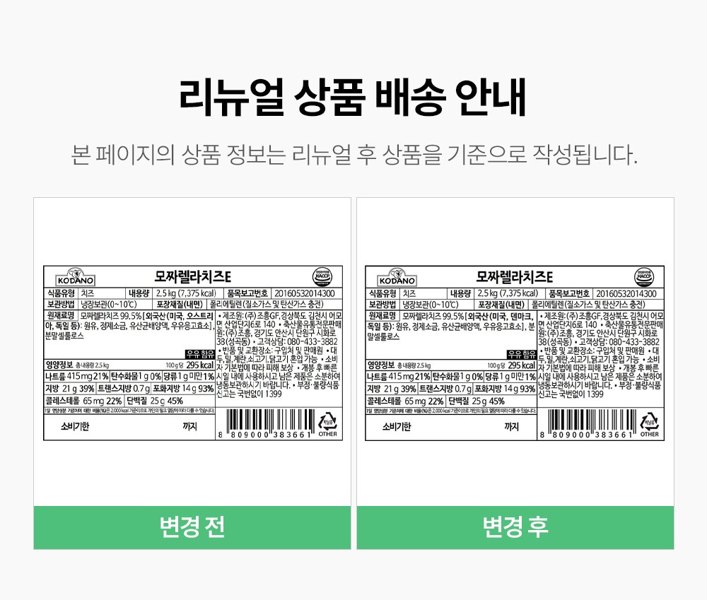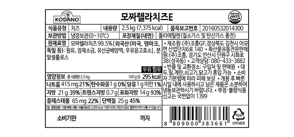 | 제품명 | 모짜렐라치즈 E | 식품의 유형 | 컨텐츠 참조 |