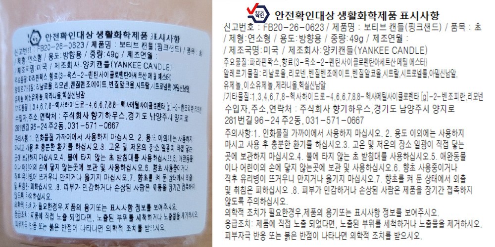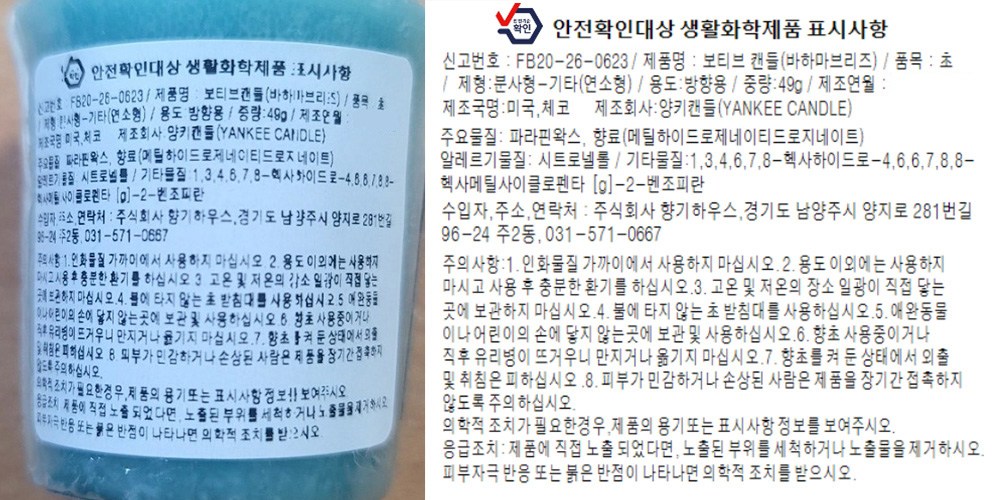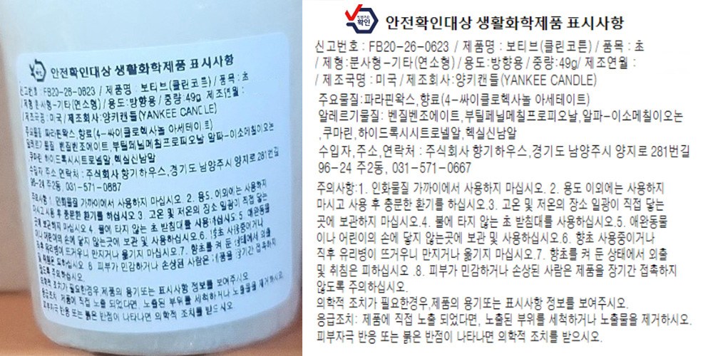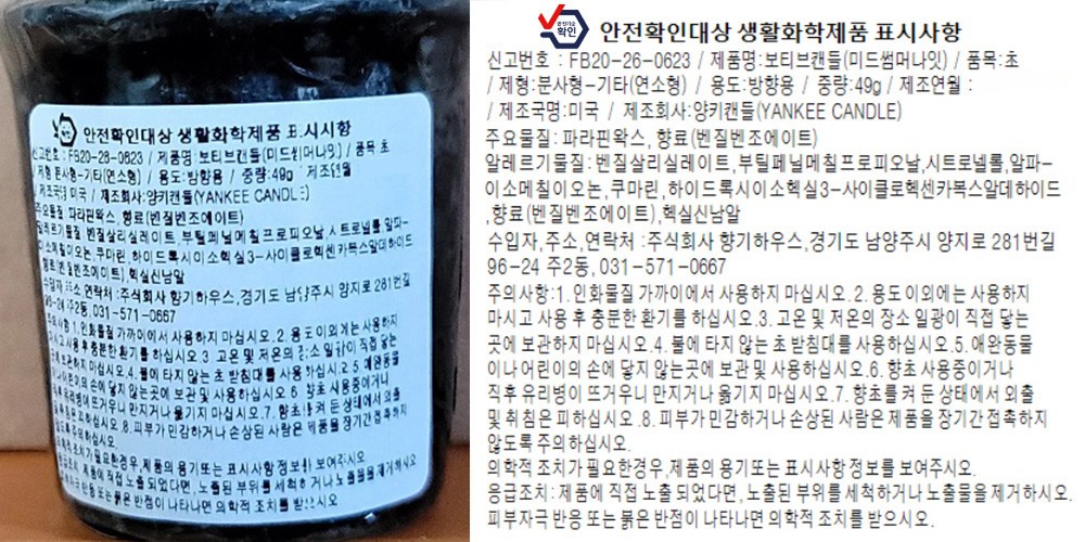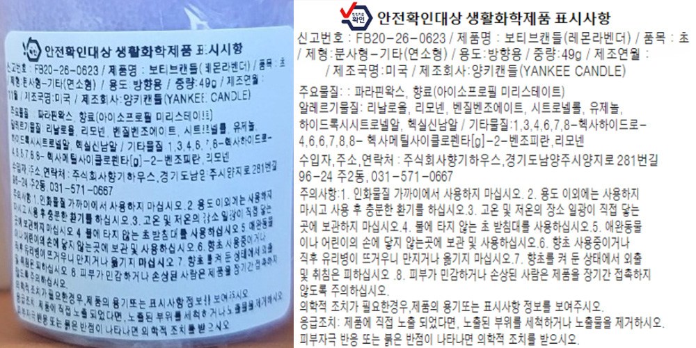 | 품목 및 제품명 | 초/보티브캔들(레몬라벤더,블랙체리,미드썸머나잇,바하마브리즈,클린코튼,핑크샌드) | 용도(표백제의 경우 계열을 함께표시) 및 제형 | 방향용/분사형-기타(연소형) |