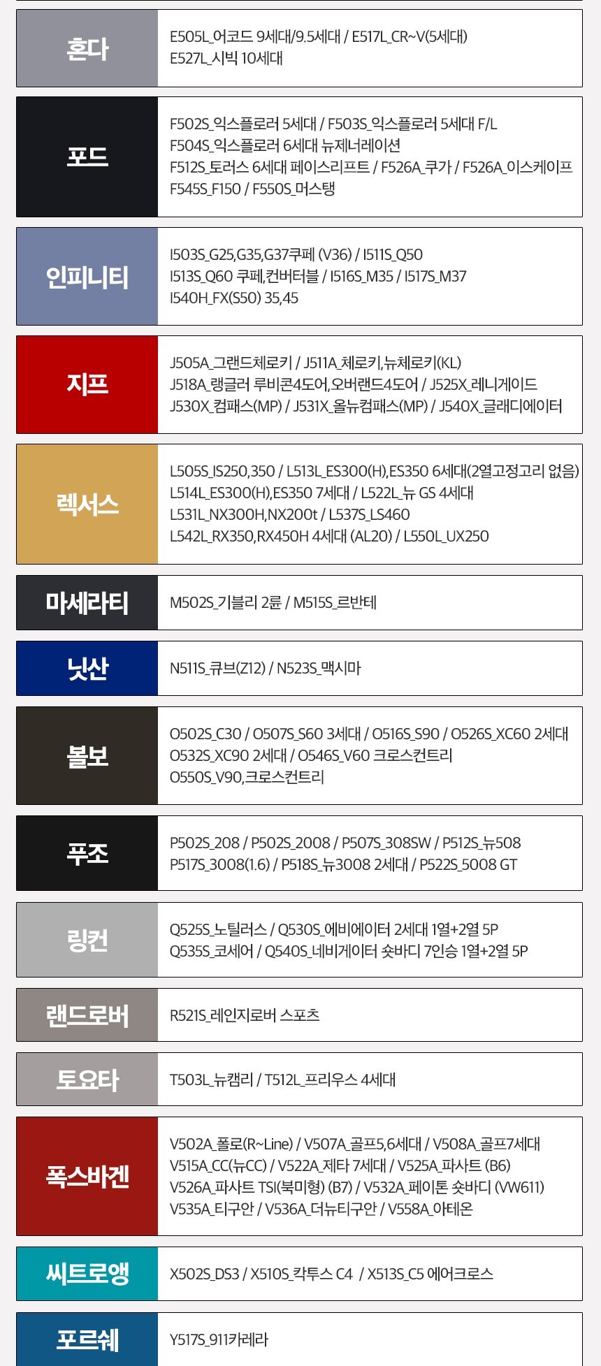 | KC 인증정보(자동차관리법에 따른 자기인증 대상 자동차부품에 한함) | 해당없음 | 제조자(수입자) | 주식회사 아리아 |
