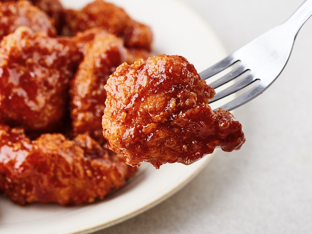 바삭한 치킨, 양념치킨 소스로 구성되어 있습니다.