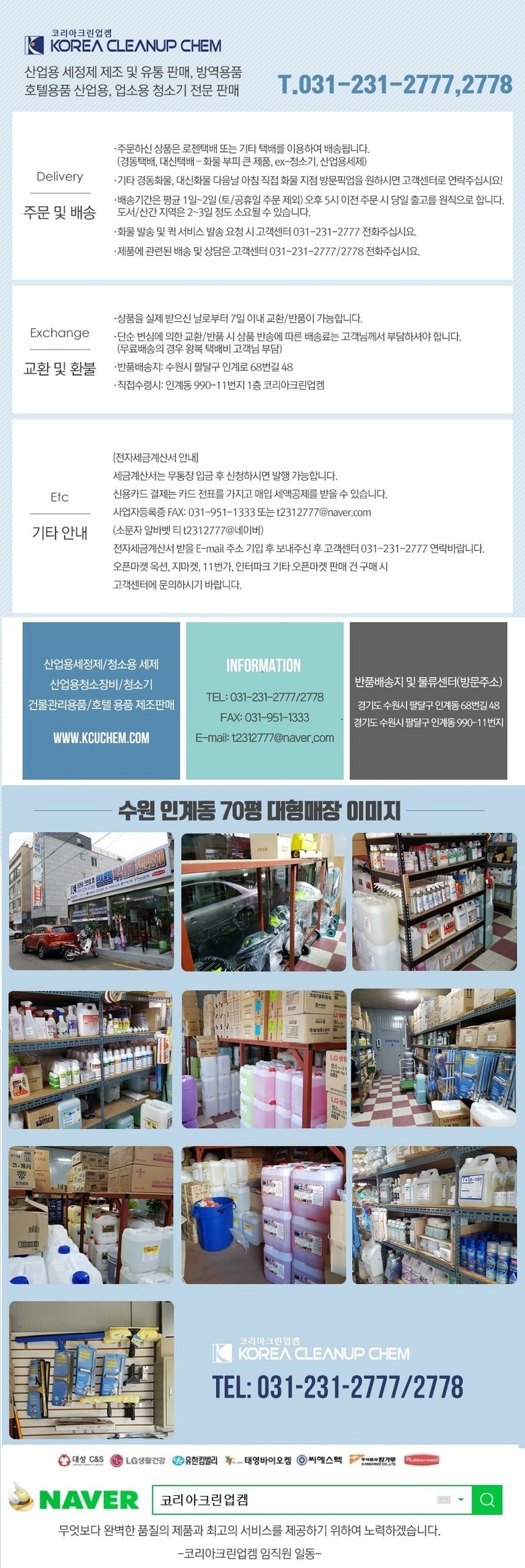 상호/대표자 | 코리아크린업켐 / 박주용 | 사업장 소재지 | 경기도 수원시 팔달구 인계로68번길 48 1층 코리아크린업켐 |