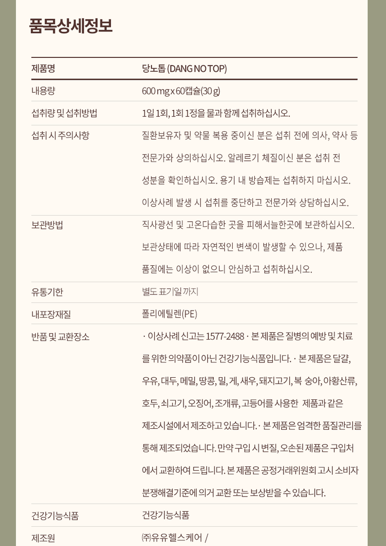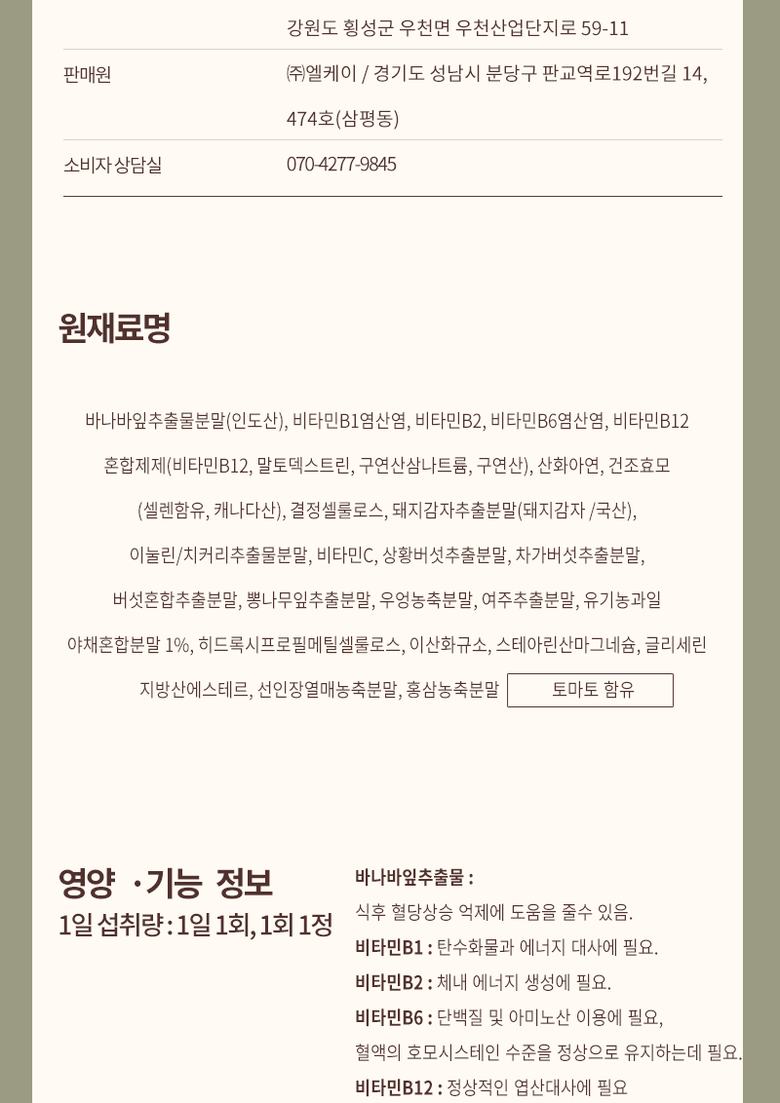 | 원료명 및 함량 | 상품 상세페이지 참조 | 영양정보 | 상품 상세페이지 참조 |