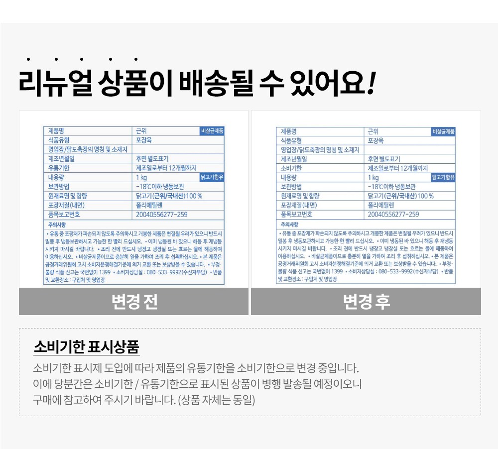 | 제조연월일, 소비기한 또는 품질유지기한 | 소비기한(또는 유통기한) : 2026년 07월 30일 이거나 그 이후인 상품 제조년월일 : 2025년 07월 31일 이후인 제조상품 | 세부 품목군별 표시사항 | 축산물 등급표시: 해당없음 / 이력번호 표시유무 - 해당없음 |