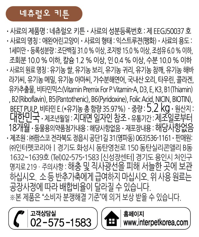| 품명 및 모델명 | 네츄럴오 키튼 | 인증/허가 사항 | 사료관리법에 따른 성분등록번호 : 컨텐츠 참조 |