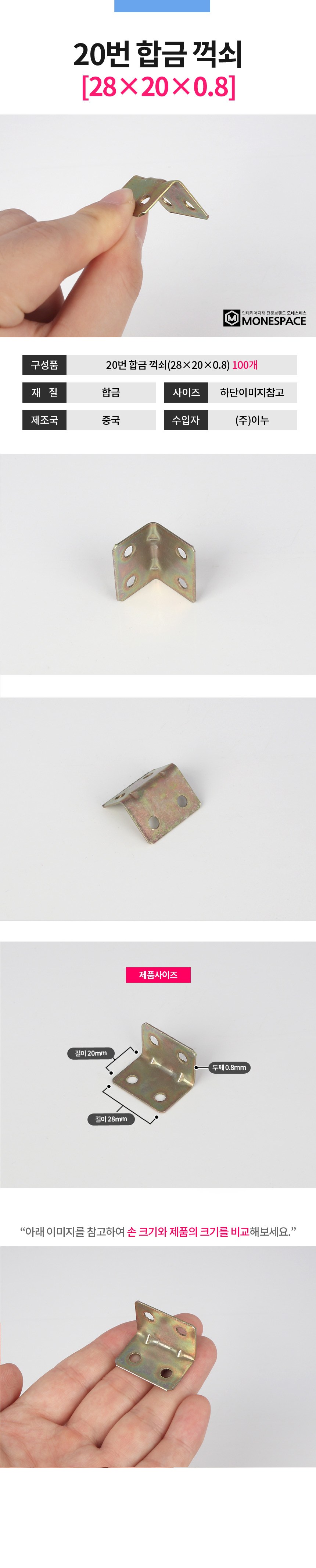 | 품명 및 모델명 | 모네스페스 20번 합금 꺽쇠 28x20x0.8 | 인증/허가 사항 | 해당없음 |