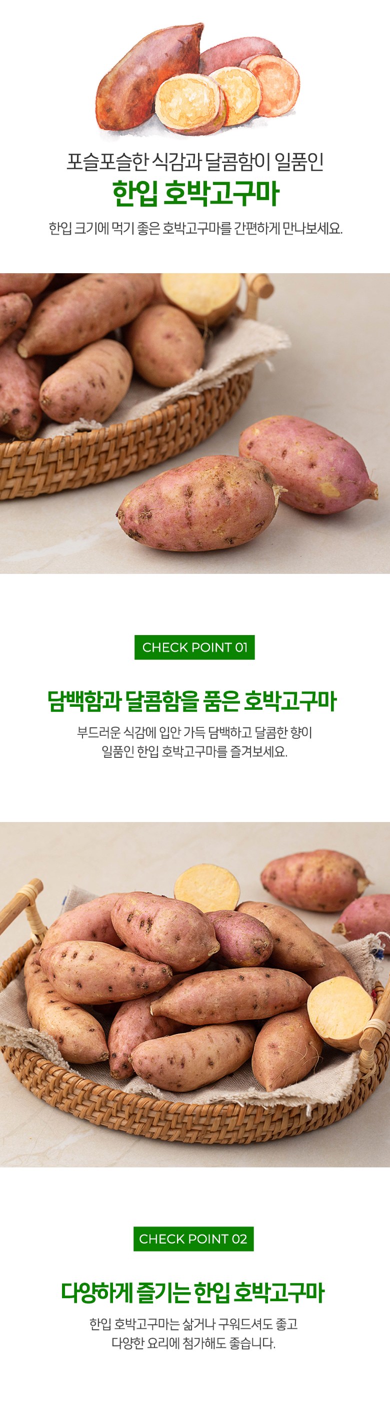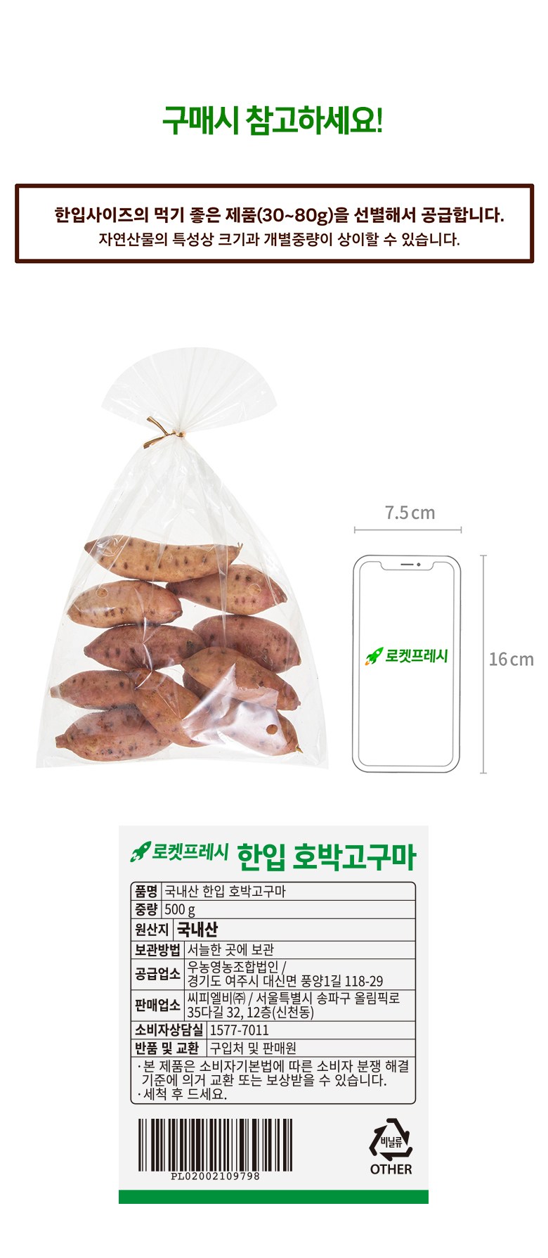 | 품목 또는 명칭 | 국내산 한입 호박고구마 | 포장단위별 내용물의 용량(중량),수량,크기 | 500g x 1개 |
