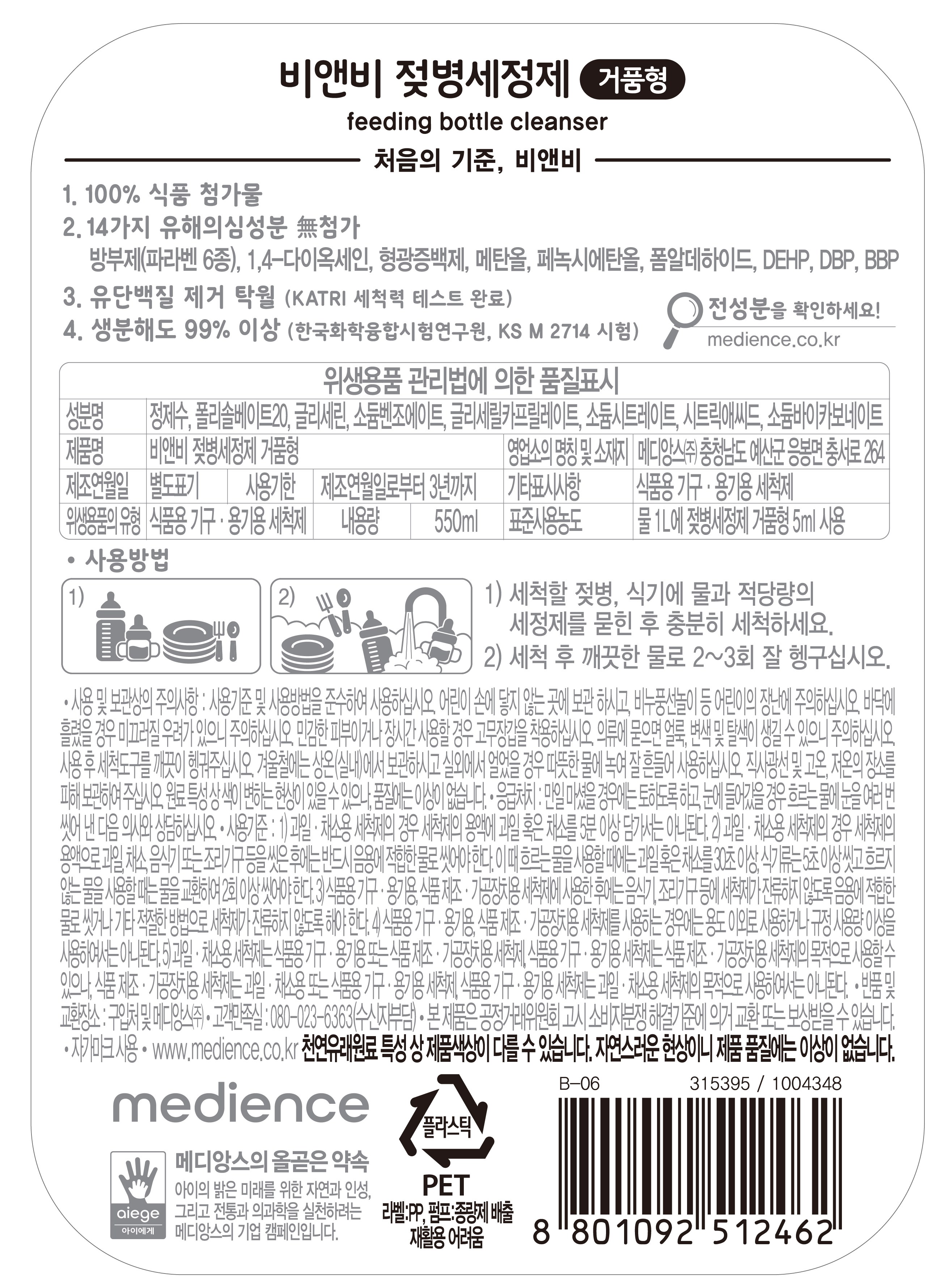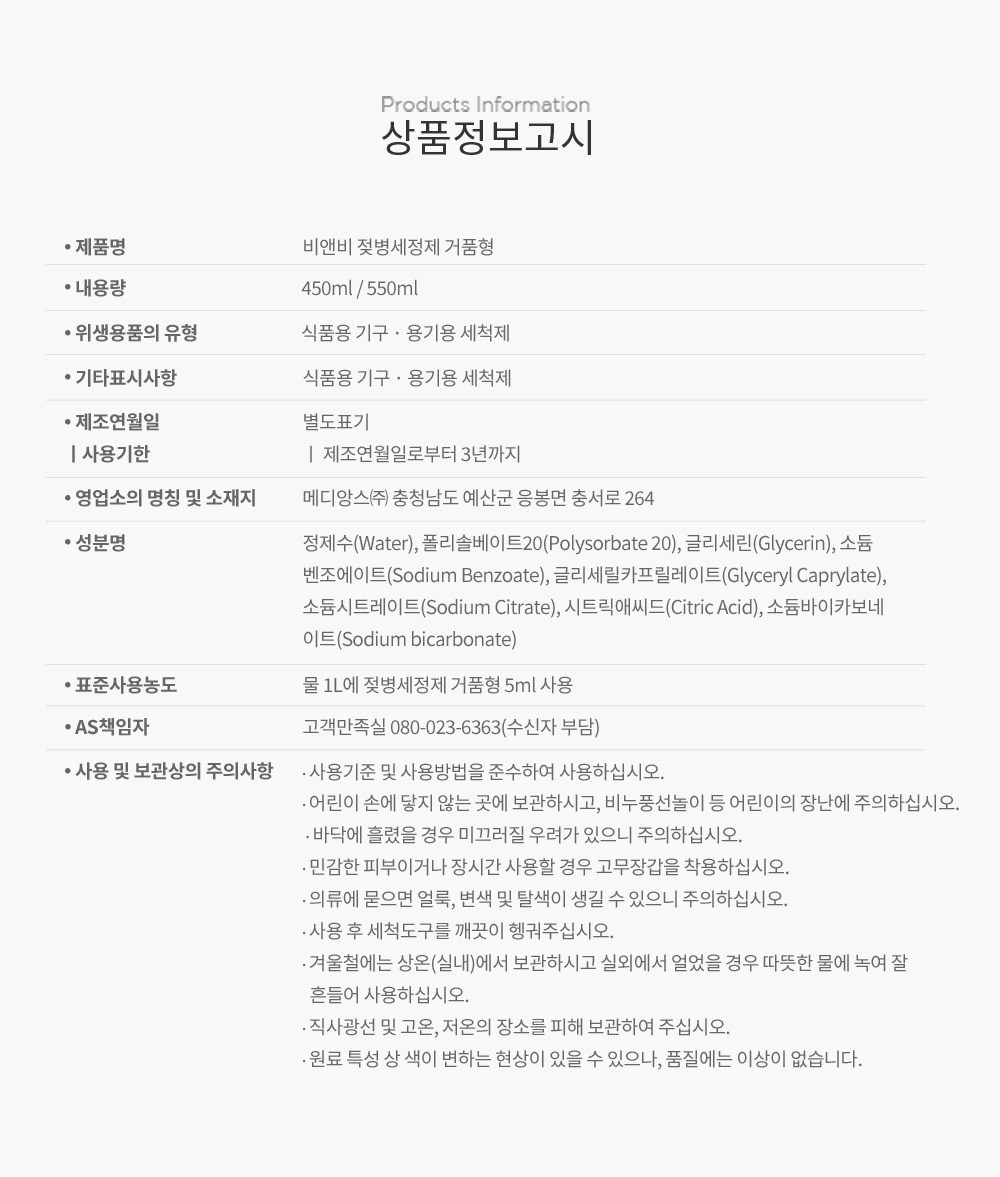 | 품명 및 모델명 | 비앤비 젖병세정제 거품형 | 인증/허가 사항 | 위생용품 |