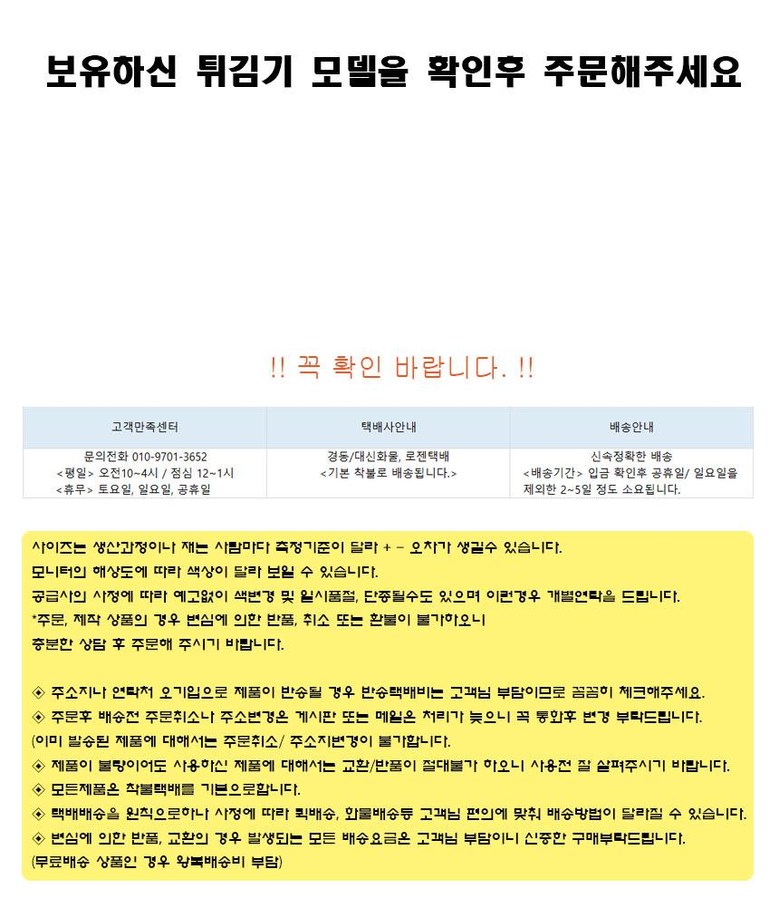 - ㆍ모니터 해상도의 차이로 인해 색상이나 이미지가 실제와 달라, 고객이 단순 변심으로 교환/반품을 무료로 요청하는 경우
