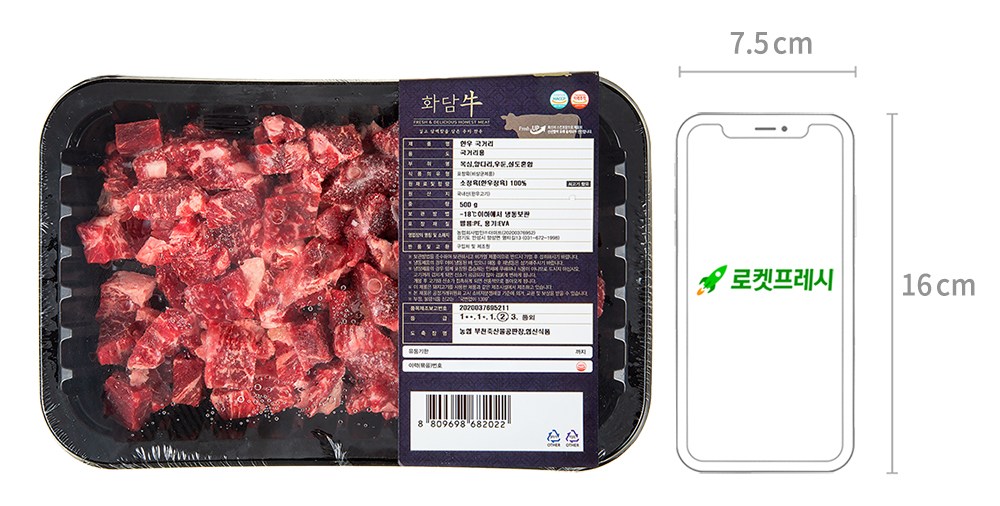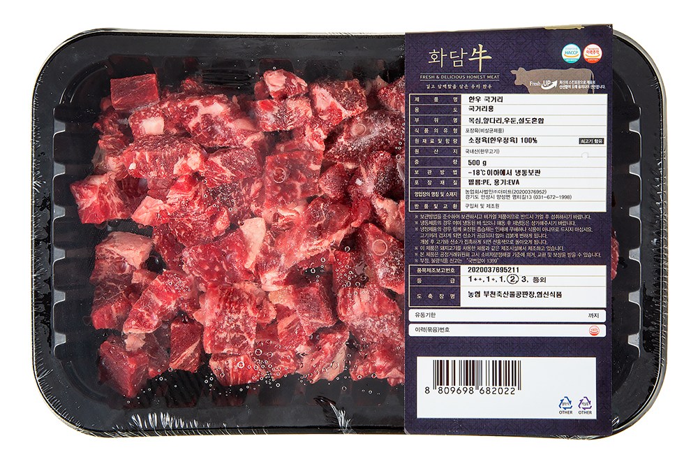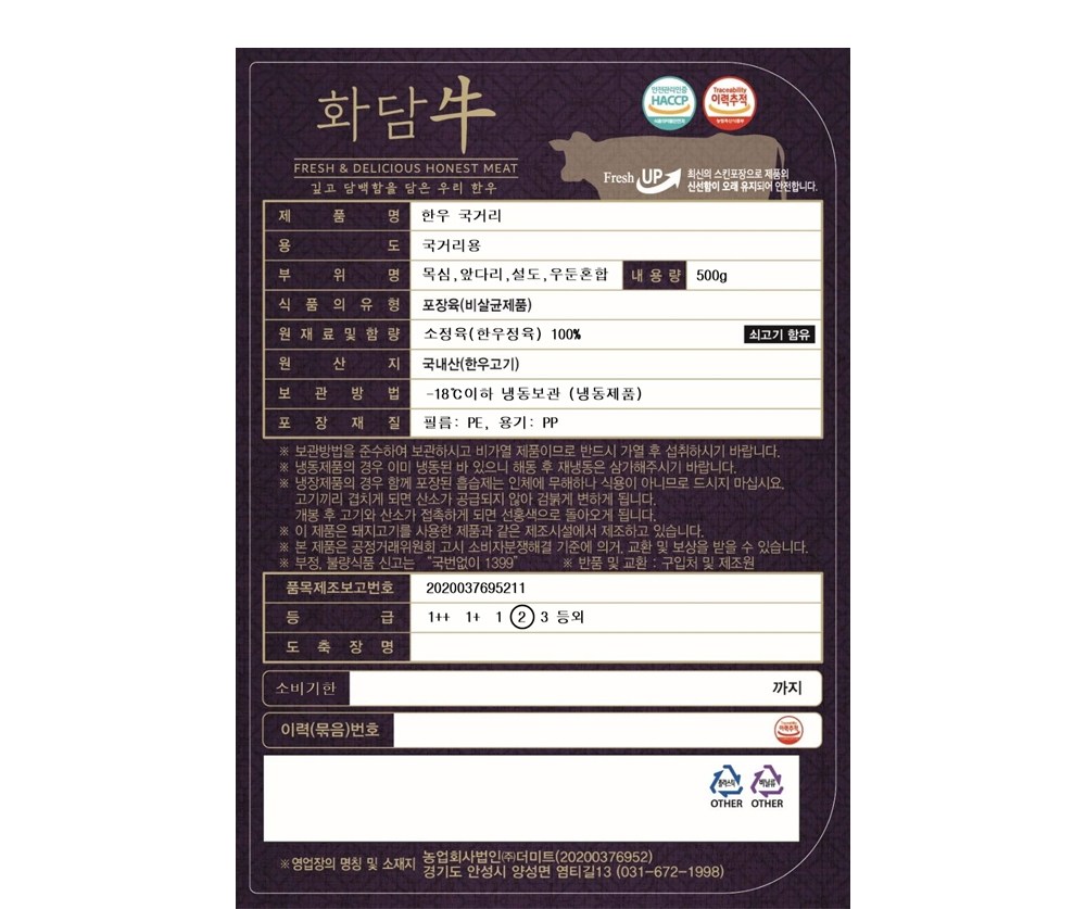 | 품목 또는 명칭 | 한우 국거리 | 포장단위별 내용물의 용량(중량),수량,크기 | 500g, 1개 |
