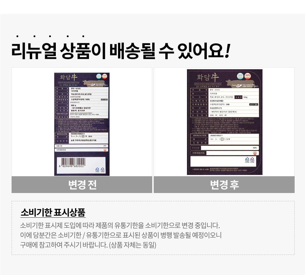 | 제조연월일, 소비기한 또는 품질유지기한 | 업데이트 예정 | 세부 품목군별 표시사항 | 축산물 등급 표시 - 2등급 / 이력번호 표시유무 - 이력번호 표시제품임 |