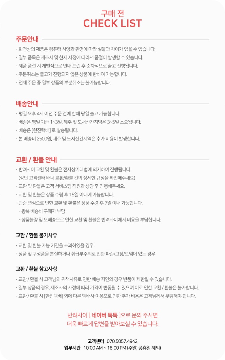 - ㆍ모니터 해상도의 차이로 인해 색상이나 이미지가 실제와 달라, 고객이 단순 변심으로 교환/반품을 무료로 요청하는 경우