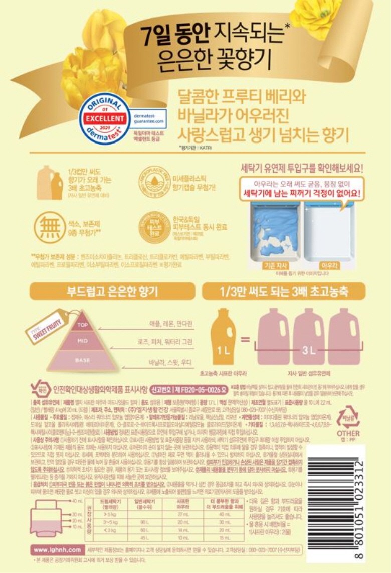 | 품목 및 제품명 | 섬유유연제 / 엘지 샤프란 아우라 미드나잇골드 알파 | 용도(표백제의 경우 계열을 함께표시) 및 제형 | 섬유용 / 비분사형-액체형 |