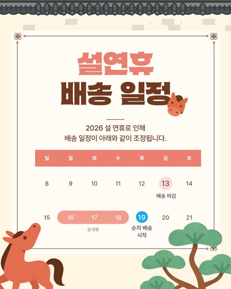 | 배송기간 | ㆍ도서산간 지역 등은 배송에 3-5일이 더 소요될 수 있습니다. - 천재지변, 물량 수급 변동 등 예외적인 사유 발생 시, 다소 지연될 수 있는 점 양해 부탁드립니다. | ||