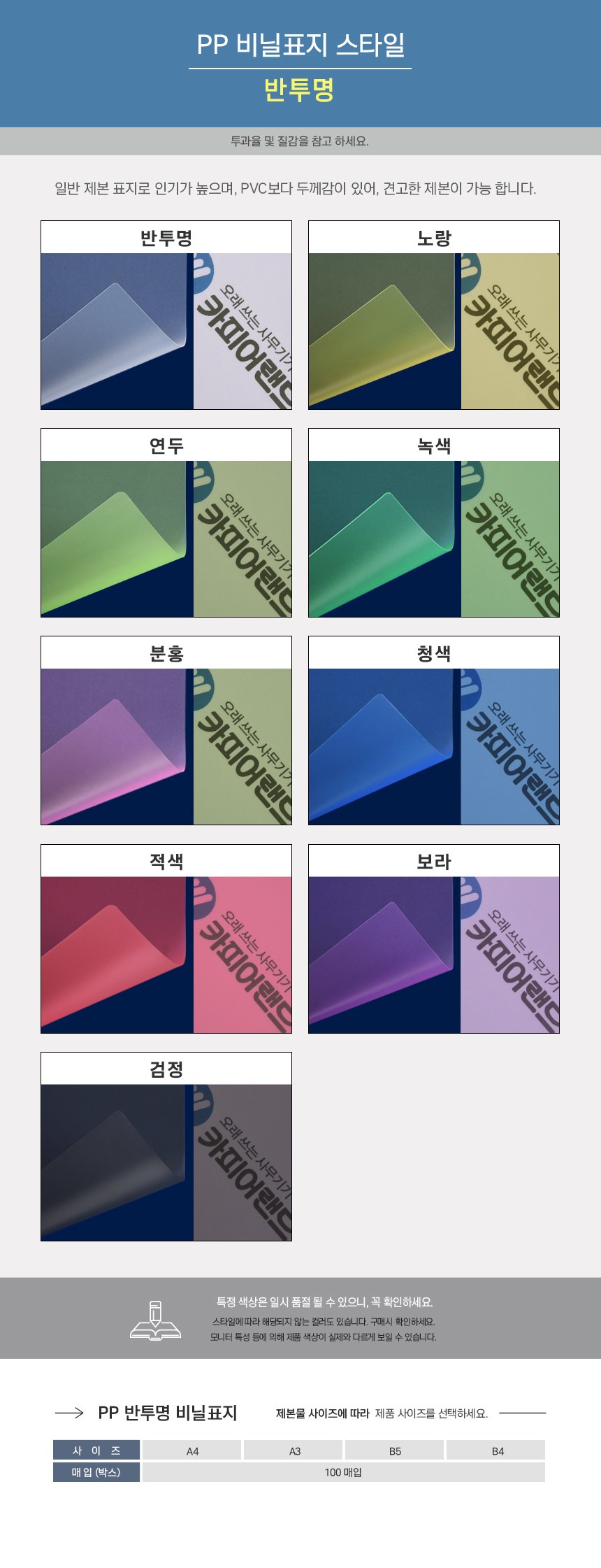 | 품명 및 모델명 | 카피어랜드 PP 제본용표지 0.5mm 100매 | 인증/허가 사항 | 해당없음 |