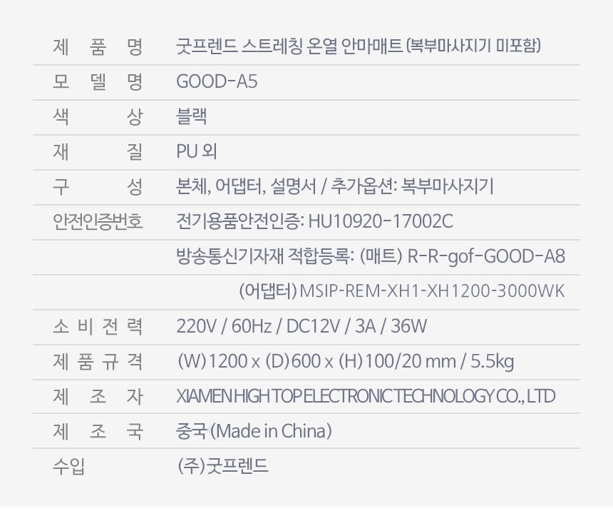 | 품명 및 모델명 | 굿프렌드 스마트 안마매트 / GOOD-A5 | KC 인증정보 | 본품 : R-R-gof-GOOD-A8, 어댑터 : HU10920-17002C, MSIP-REM-XH1-XH1200-3000WK |