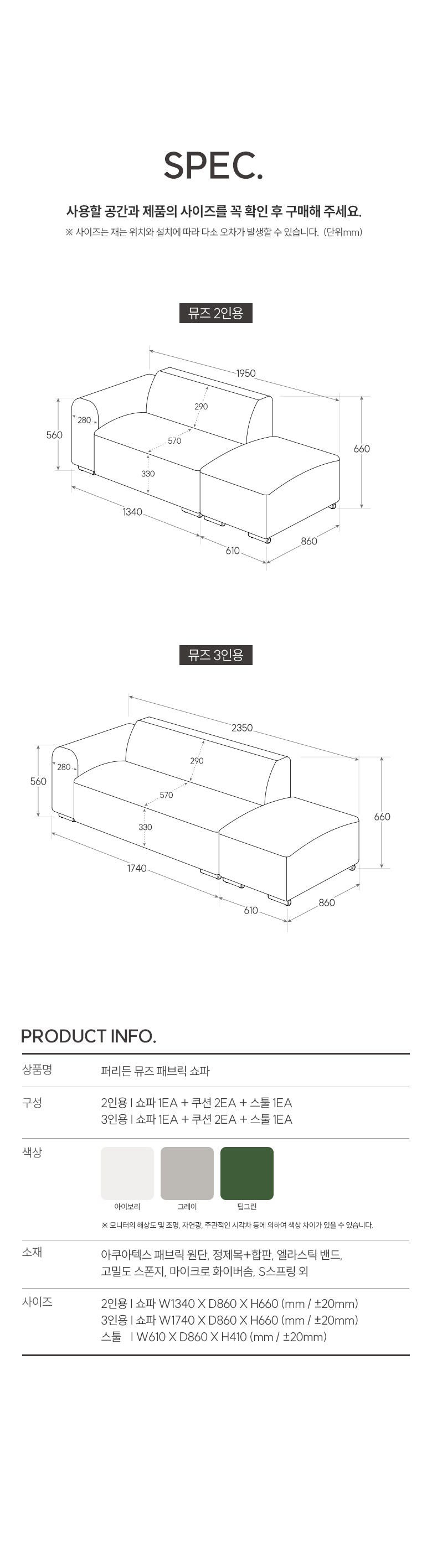- 사이즈: 소파(W1740 x D860 x H660 mm), 스툴(W610 x D860 x H410 mm)