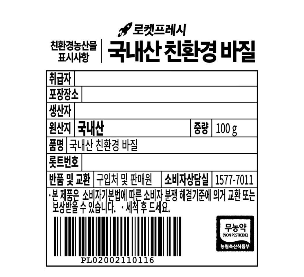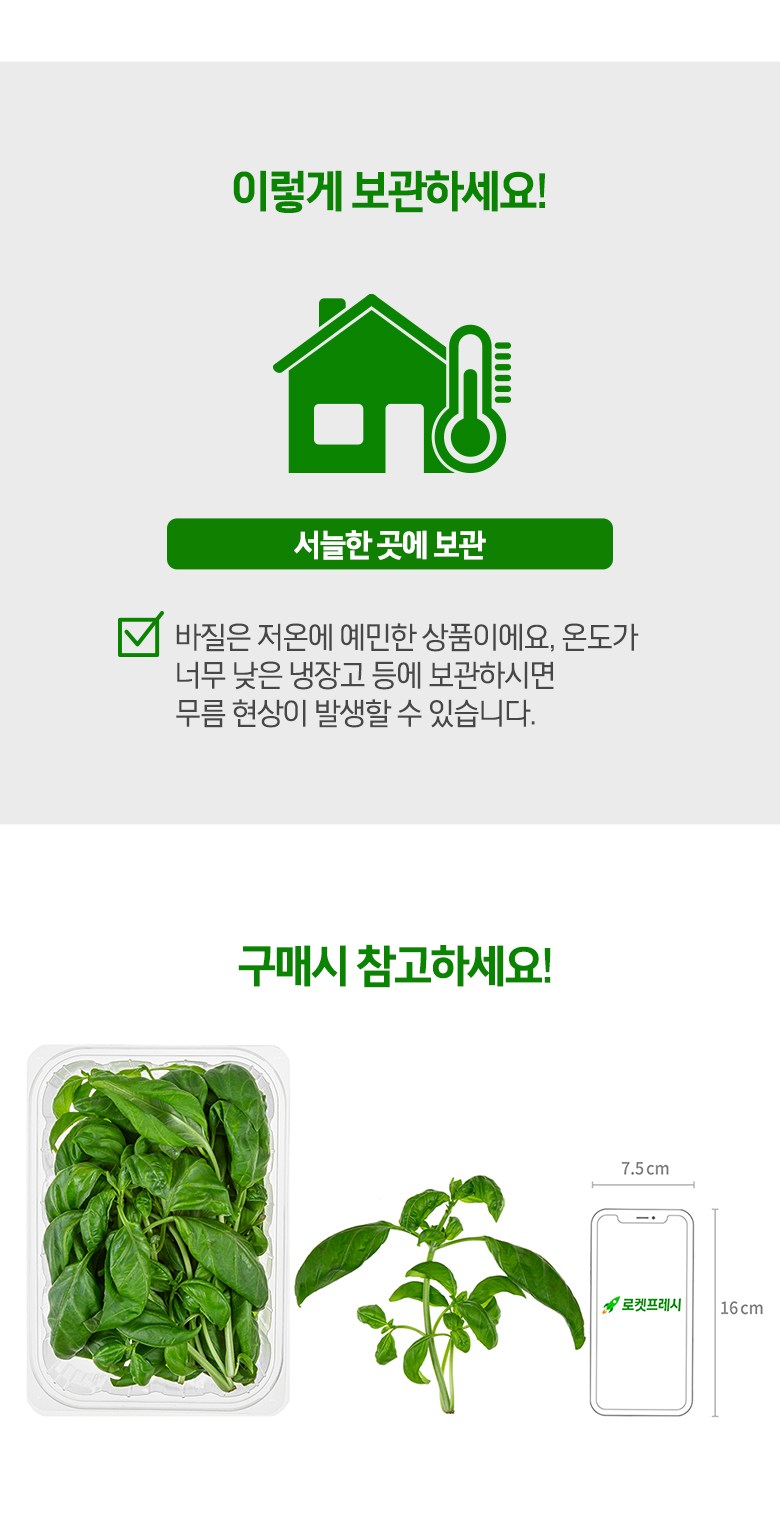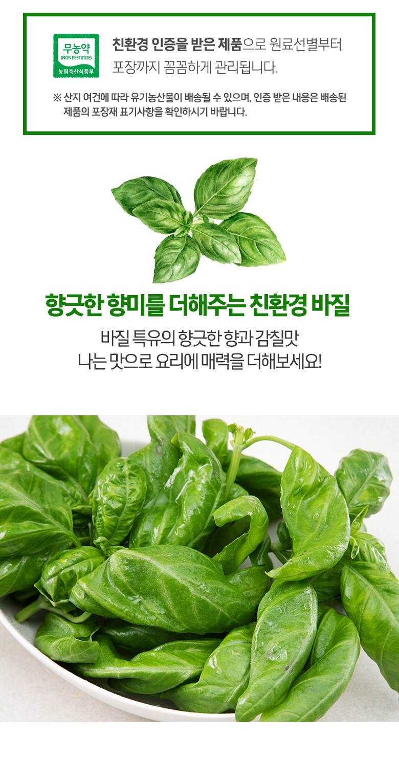 | 품목 또는 명칭 | 친환경 바질 100g, 1팩 | 포장단위별 내용물의 용량(중량),수량,크기 | 100g x 4팩 |
